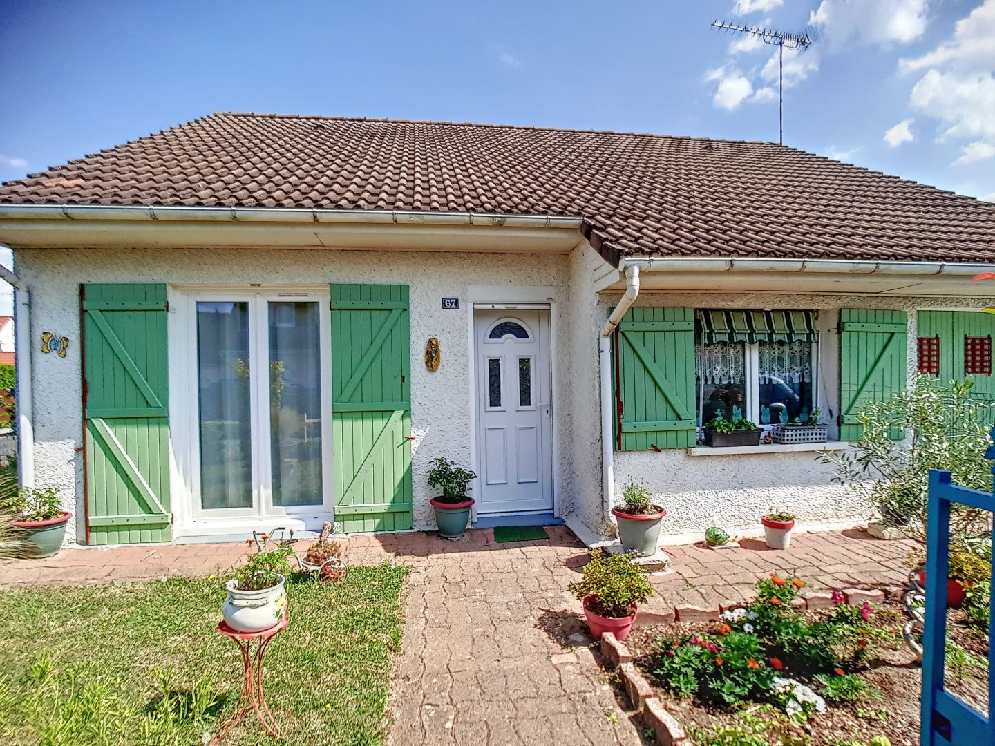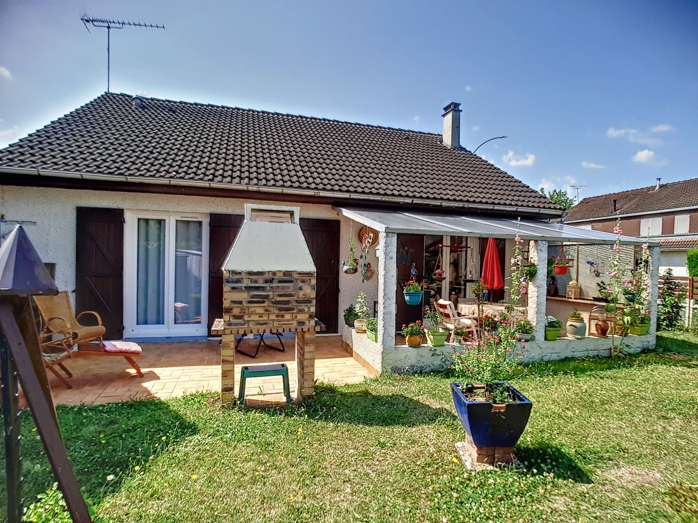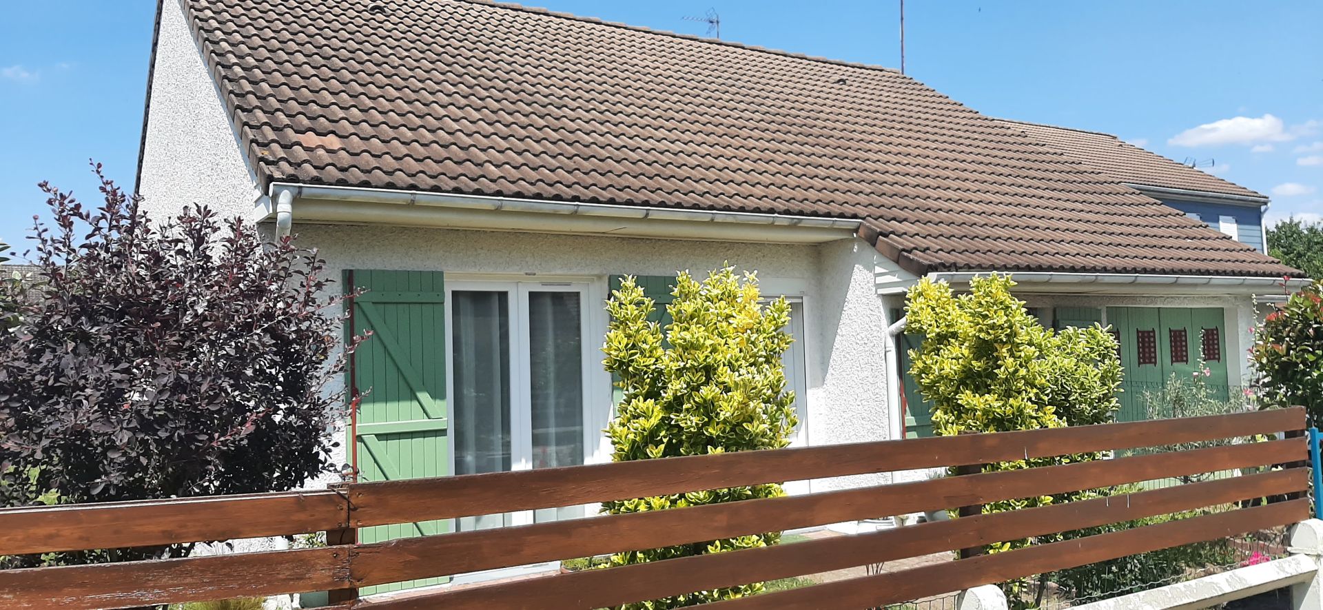 Pavillon de plain pied dans quartier calme et proche de toutes commodités, dont les 76 m2 se décomposent en entrée, dégagement avec placards, cuisine aménagée&partiellement équipée, salon séjour avec cheminée donnant sur une terrasse de 30 m², 2 chambres avec porte-fenêtre, bureau ou chambre d'enfant, salle d'eau et wc. Huisseries double vitrage. Garage. 2 cabanons. Terrain clos de 360 m²